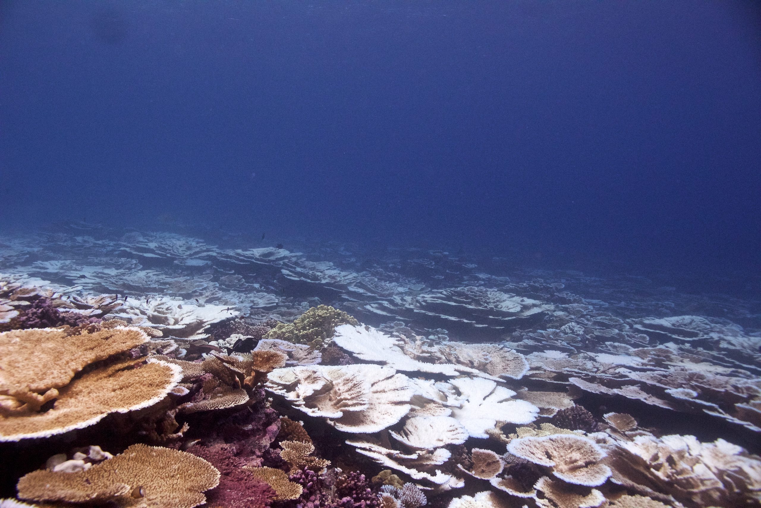Im Juli 2015 begann die Korallenbleiche bei großen Plattenkorallen (Acropora) auf Kiritimati / Foto: Kristina Tietjen. Baum Lab, University of Victoria