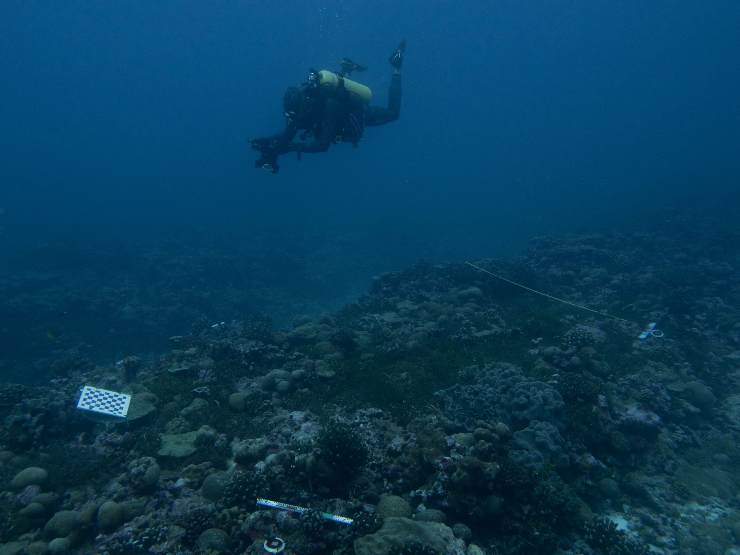Ein Forschungstaucher des Baum Lab’s erstellt Unterwasseraufnahmen für ein sogenanntes MPQ (Mega Photo Quadrat), eine standardisierte Methode zur detaillierten Erfassung der Korallenbedeckung und Riffstruktur. / Foto: Mareike de Breuyn. Baum Lab, University of Victoria