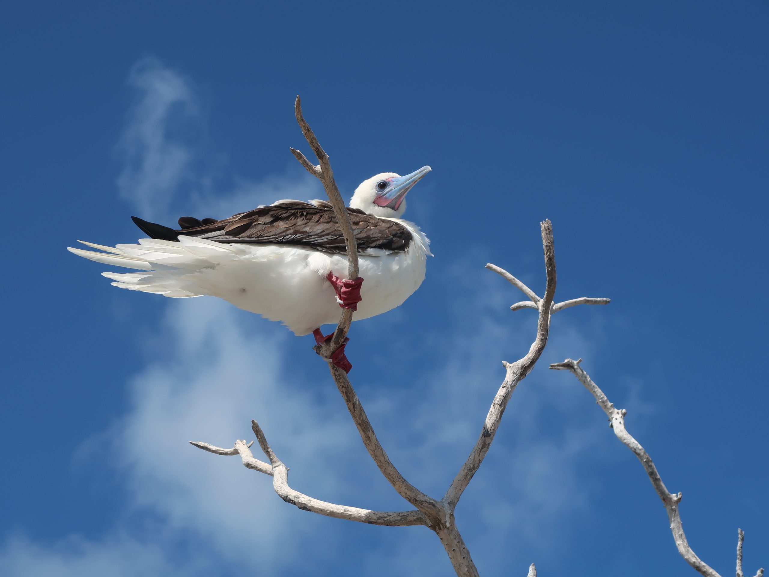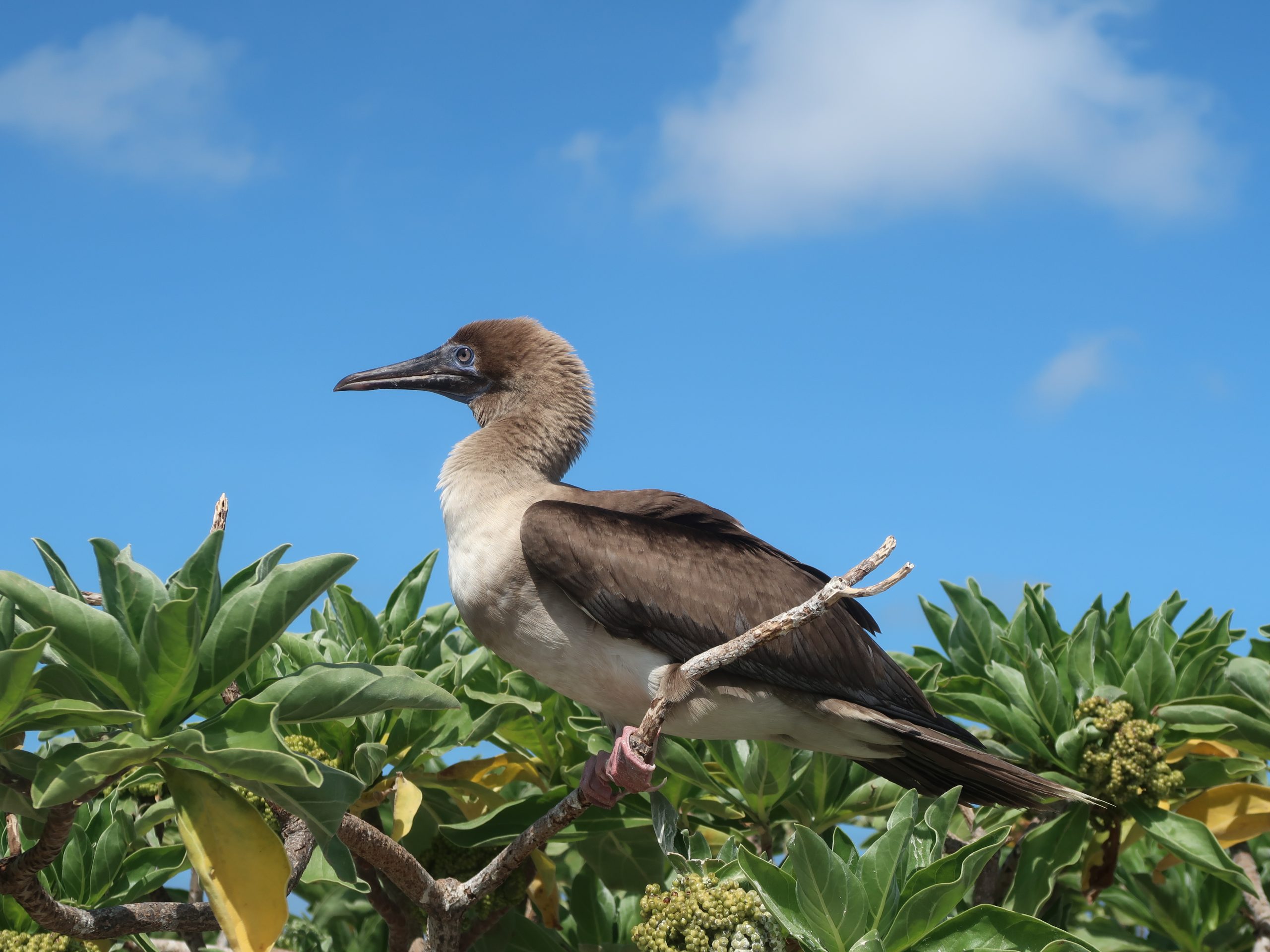 Der Rotfußtölpel (Sula sula) ist auf Kiritimati ein häufiger Brutvogel. Er nutzt die abgeschiedenen Sandbänke sowie die niedrige Vegetation des Atolls als Nistplätze und ist eng an die produktiven marinen Nahrungsnetze der umliegenden Korallenriffe gebunden / Foto: Mareike de Breuyn. Baum Lab, University of Victoria
