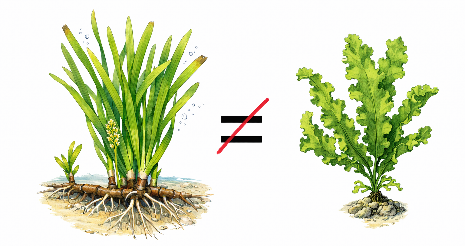 Seegraspflanze mit echten Wurzeln, horizontalen Verzweigungen, und Blättern (links), sowie typische Alge ohne diese Pflanzenmerkmale (rechts) / Grafik: Felix I. Roßbach mit Unterstützung von KI