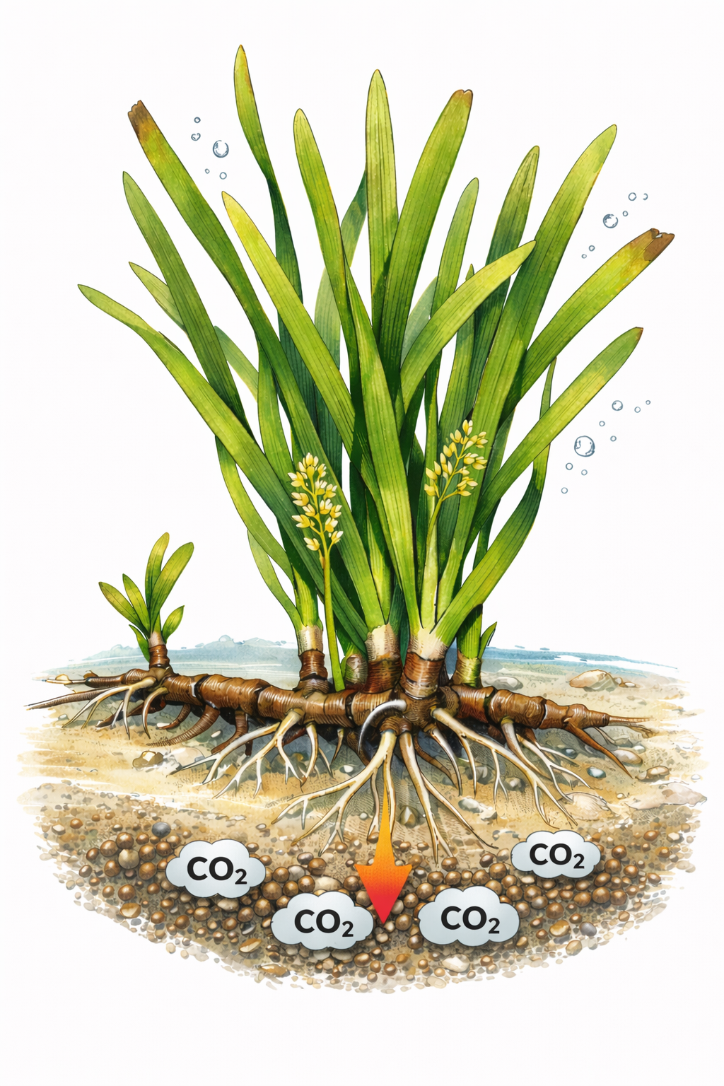 Abbildung 2: Seegraspflanzen binden durch Ihr Wurzelsystem große Mengen CO2 langfristig im Meeresgrund / Grafik: Felix I. Roßbach mit Unterstützung von KI